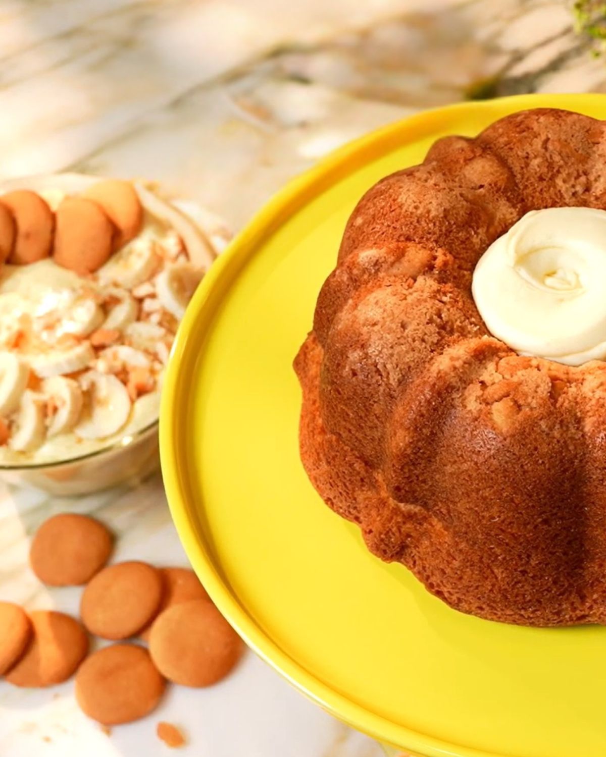 This Everyday Grand Banana Pudding Bundt Cake is inspired by Mama Joyce’s classic banana pudding the one that barely made it to the table before everyone grabbed a scoop. The tender banana pudding-infused crumb, cream cheese frosting, and buttery Nilla wafer crumble come together for that nostalgic, homemade taste in an easy-to-serve bundt cake.